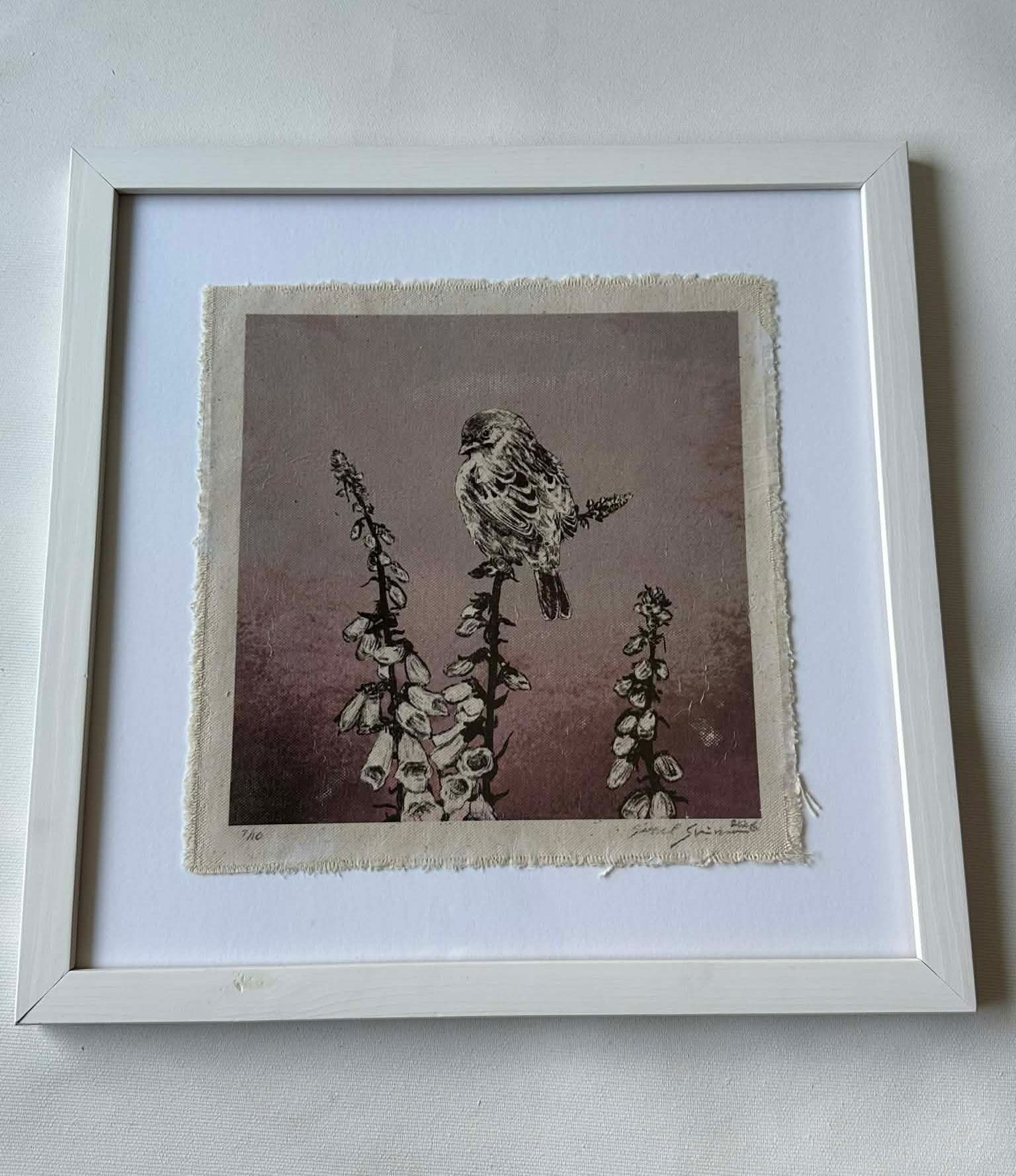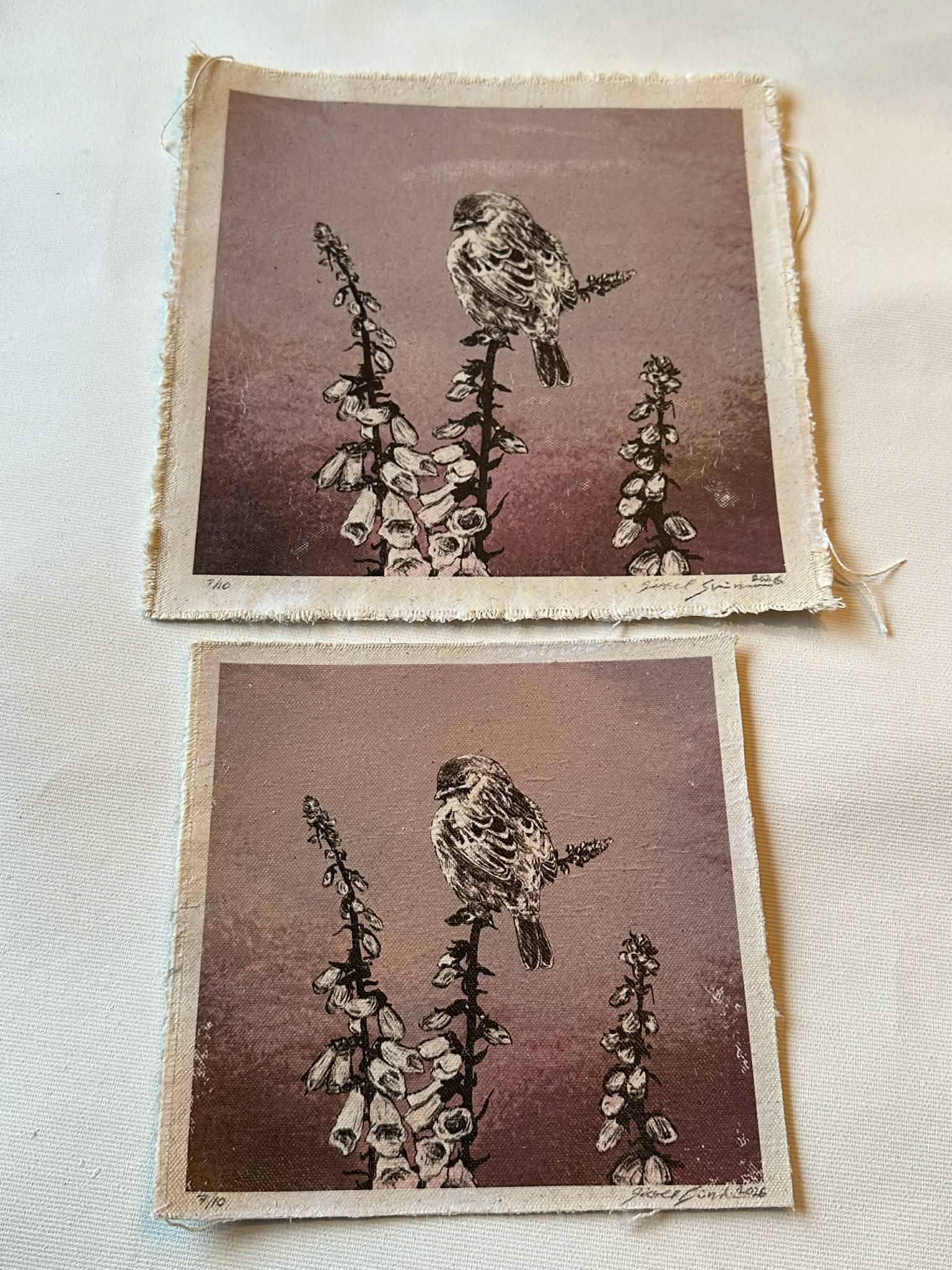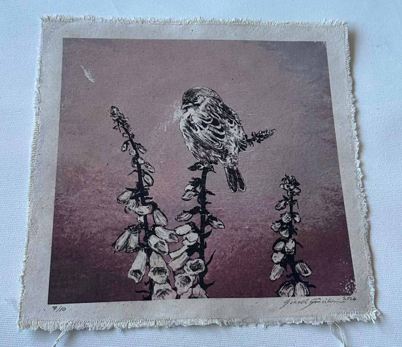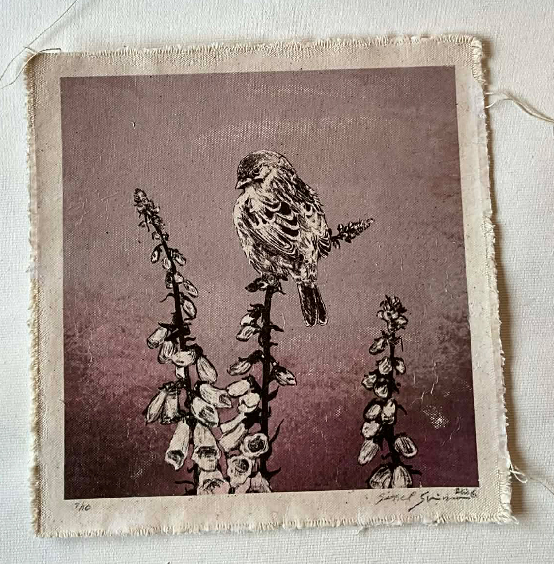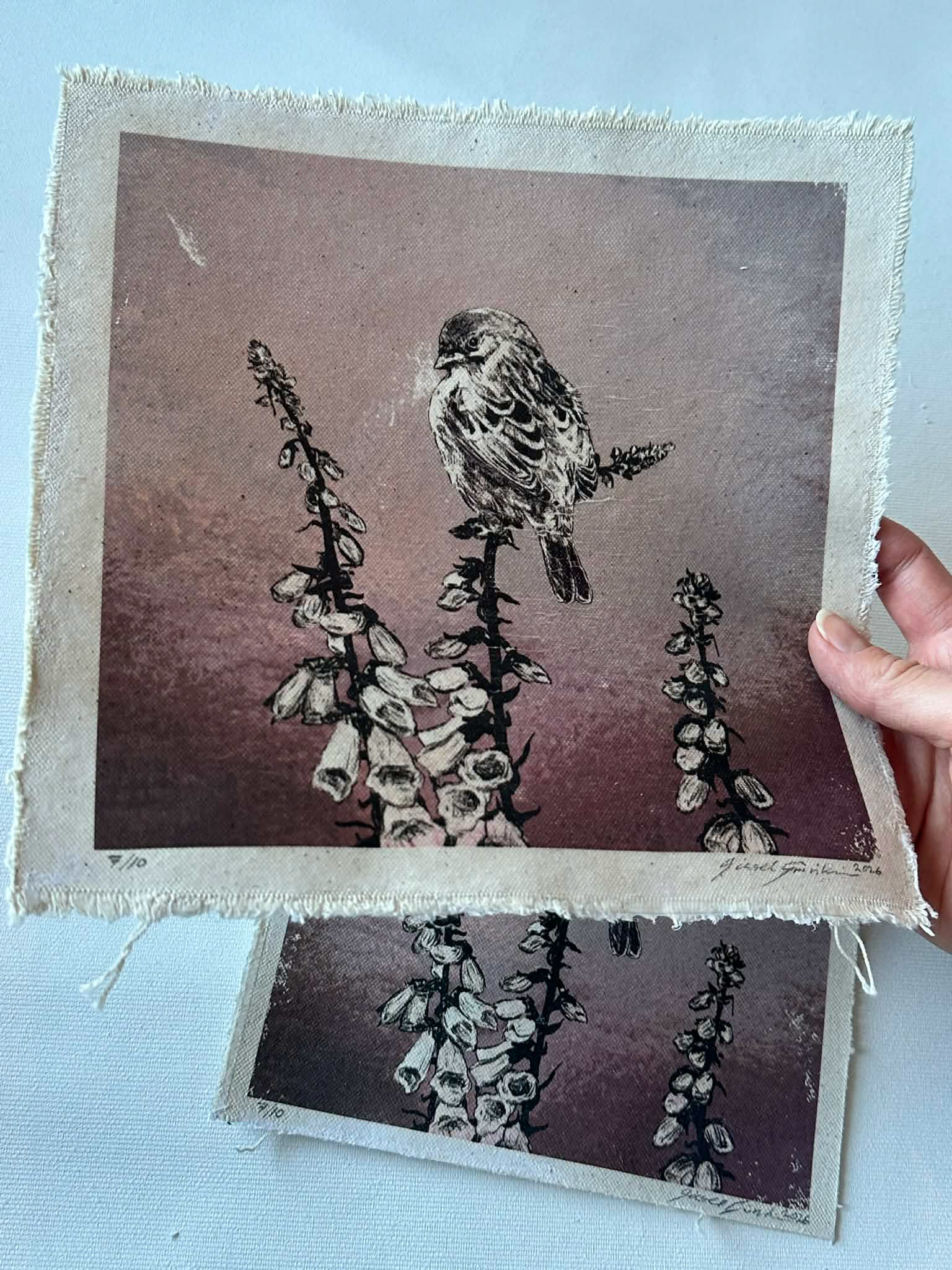 Digital teikning, handoverført til ubehandla bomullslerret (mixed media)