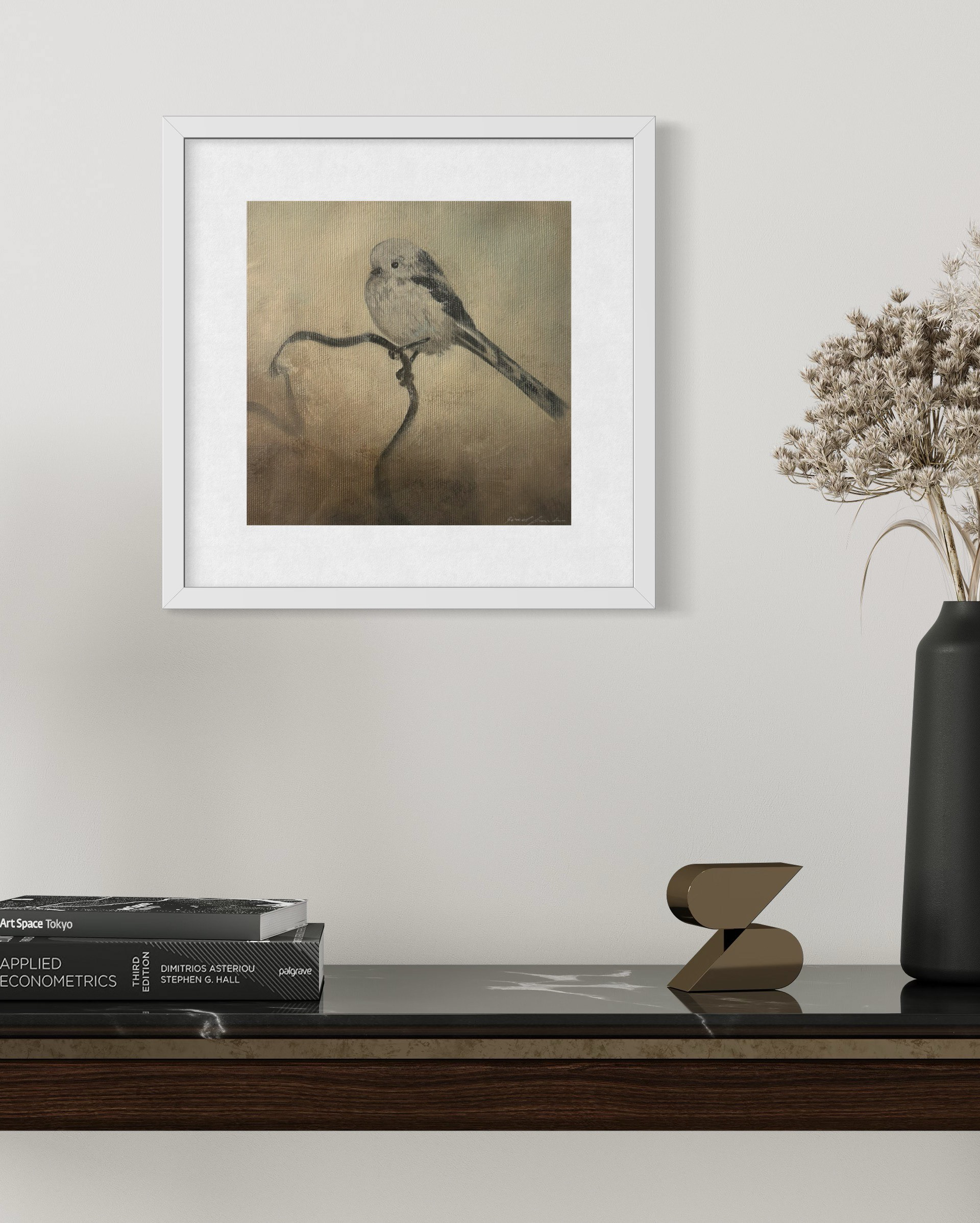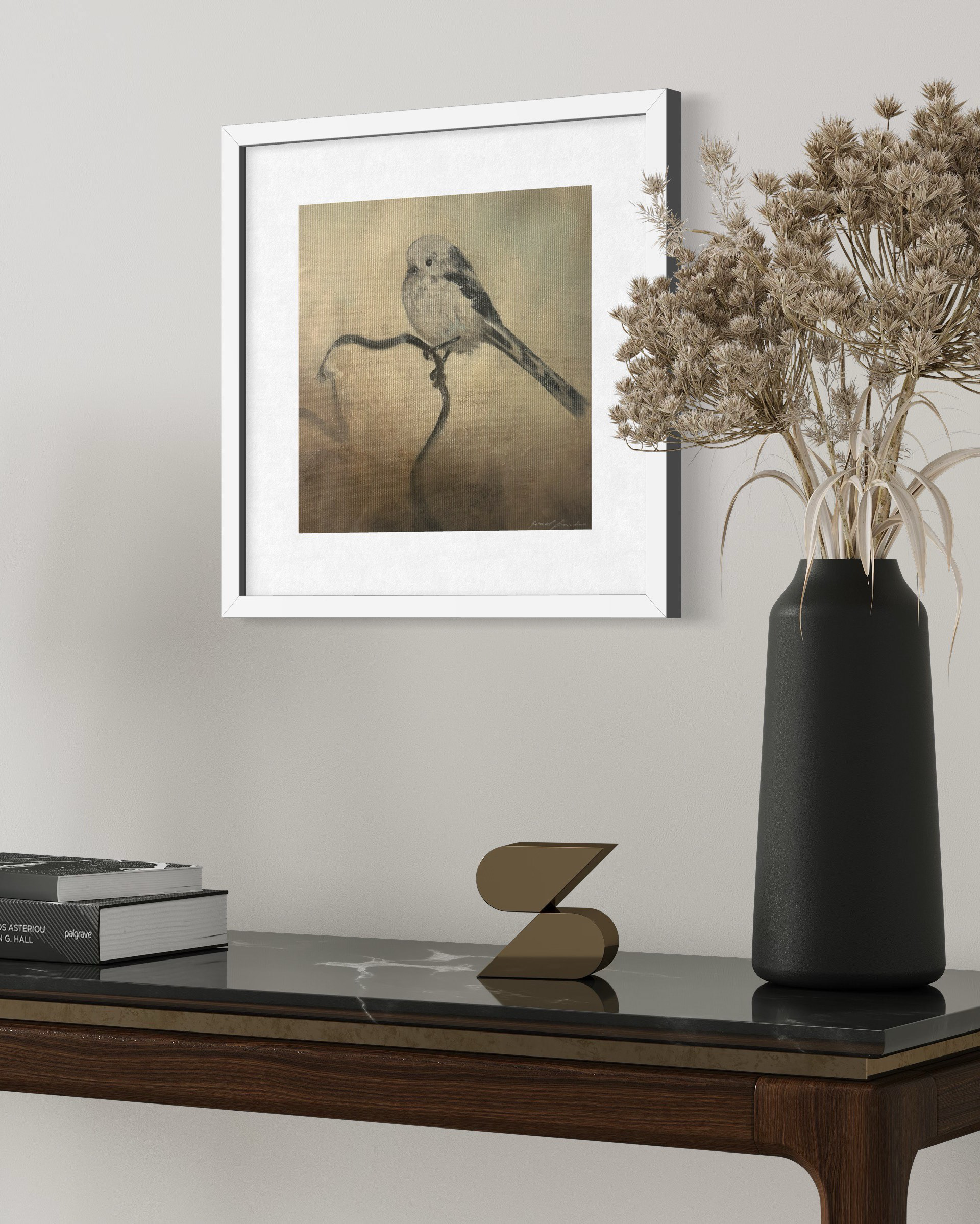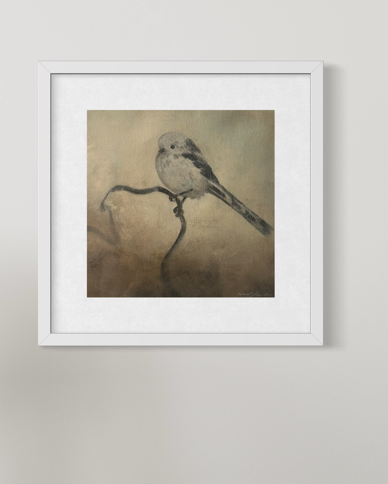 Medium: Kullteikning og akryl maling på lerret, innrammet
