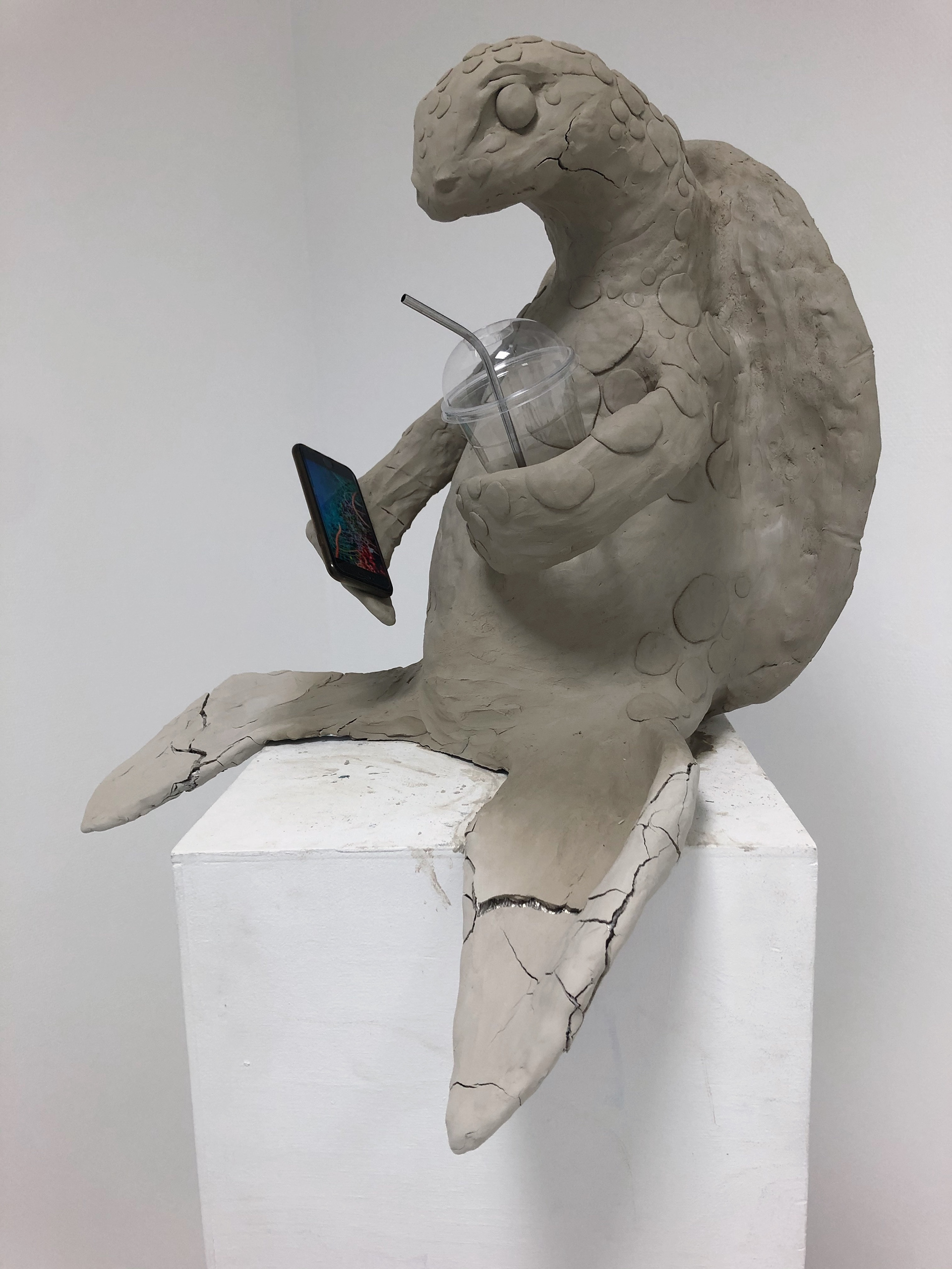 Skilpadden holder en mobil der det spilles av en dokumentar om plast og forurensing i havet. I den andre handa har skilpadden en engangskopp i plast med et metalsugerør i. Dette symboliserer hvordan vi forholder oss til miljøtiltak. Vi blir påvirket av en dokumentar og handler med å ta et bærekraftig valg som gjør at vi føler oss bedre. Som her vises med metalsugerøret. Med denne enkle handlingen i fokus glemmer vi fort bort alle di andre mindre bærekraftige valga vi tar hver dag. Foreksempel å bruke en engangskopp av plast. Metalsugerøret og plastkoppen skaper en kontrast mellom miljøbevisst og miljøsvin.